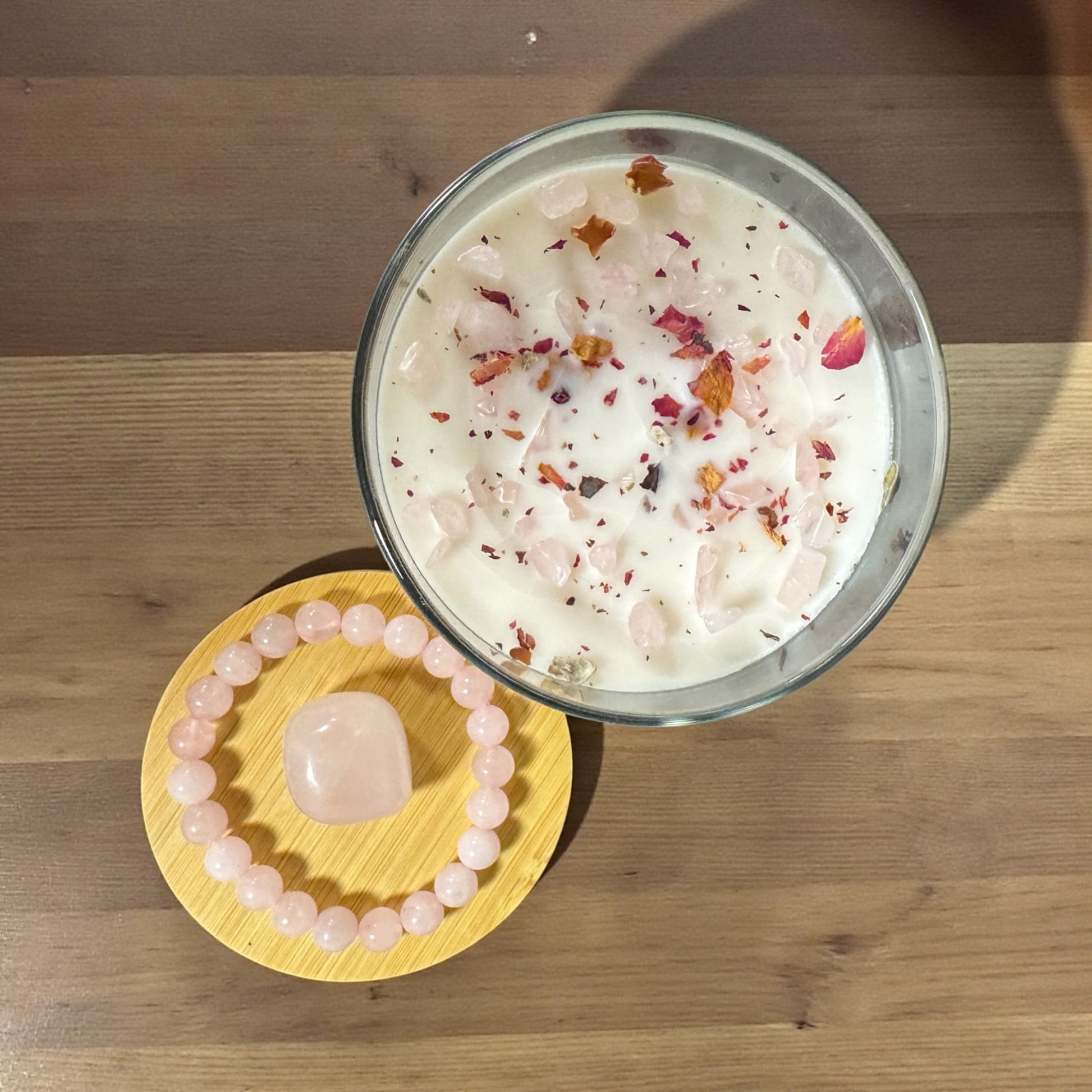 Indulge in the delicate essence of fresh roses with this hand-poured soy candle, thoughtfully crafted to elevate your space. Each vessel is adorned with dried rose petals and rose quartz chips, creating a visually enchanting centerpiece.